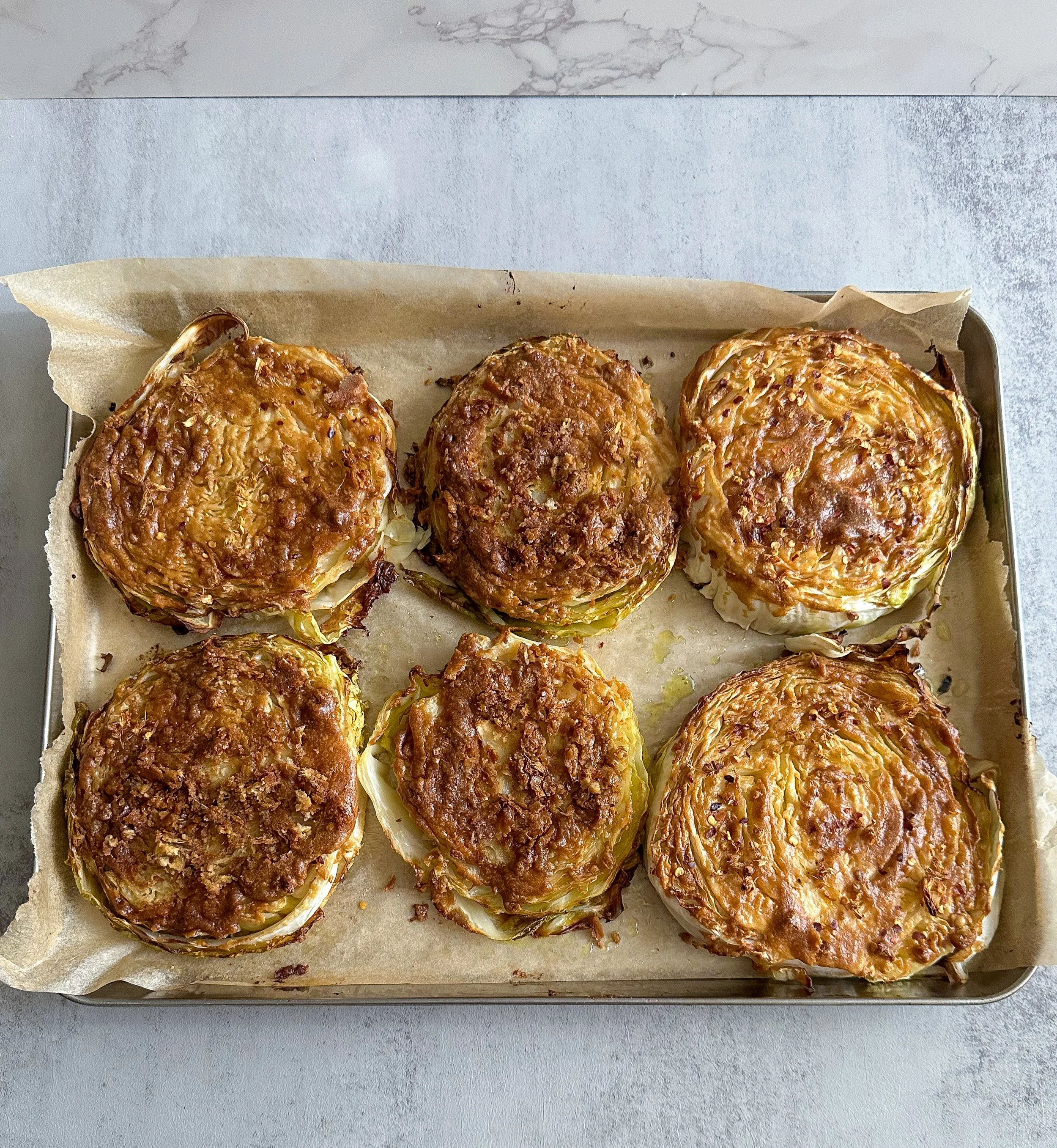 - Brush the top side of each cabbage steak generously with the tahini dressing.