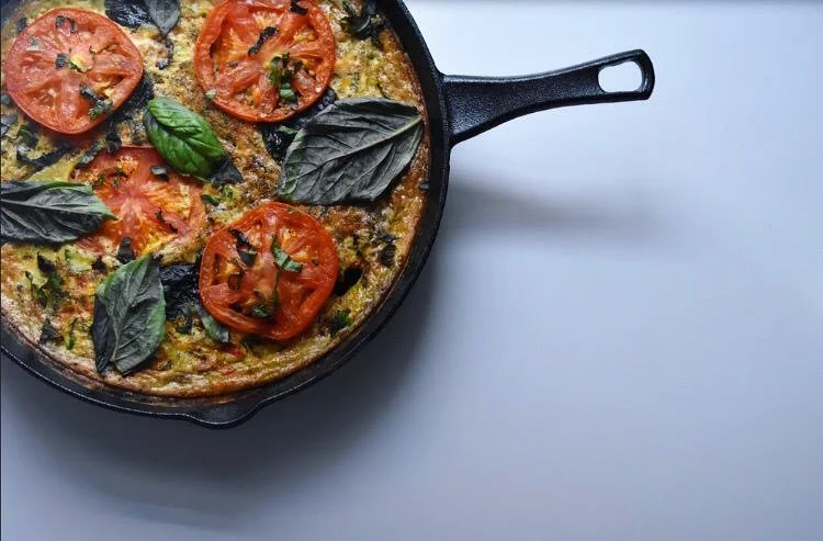 - Once the egg firms up a bit, pat tomato slices dry again, then layer them gently on top of the frittata.