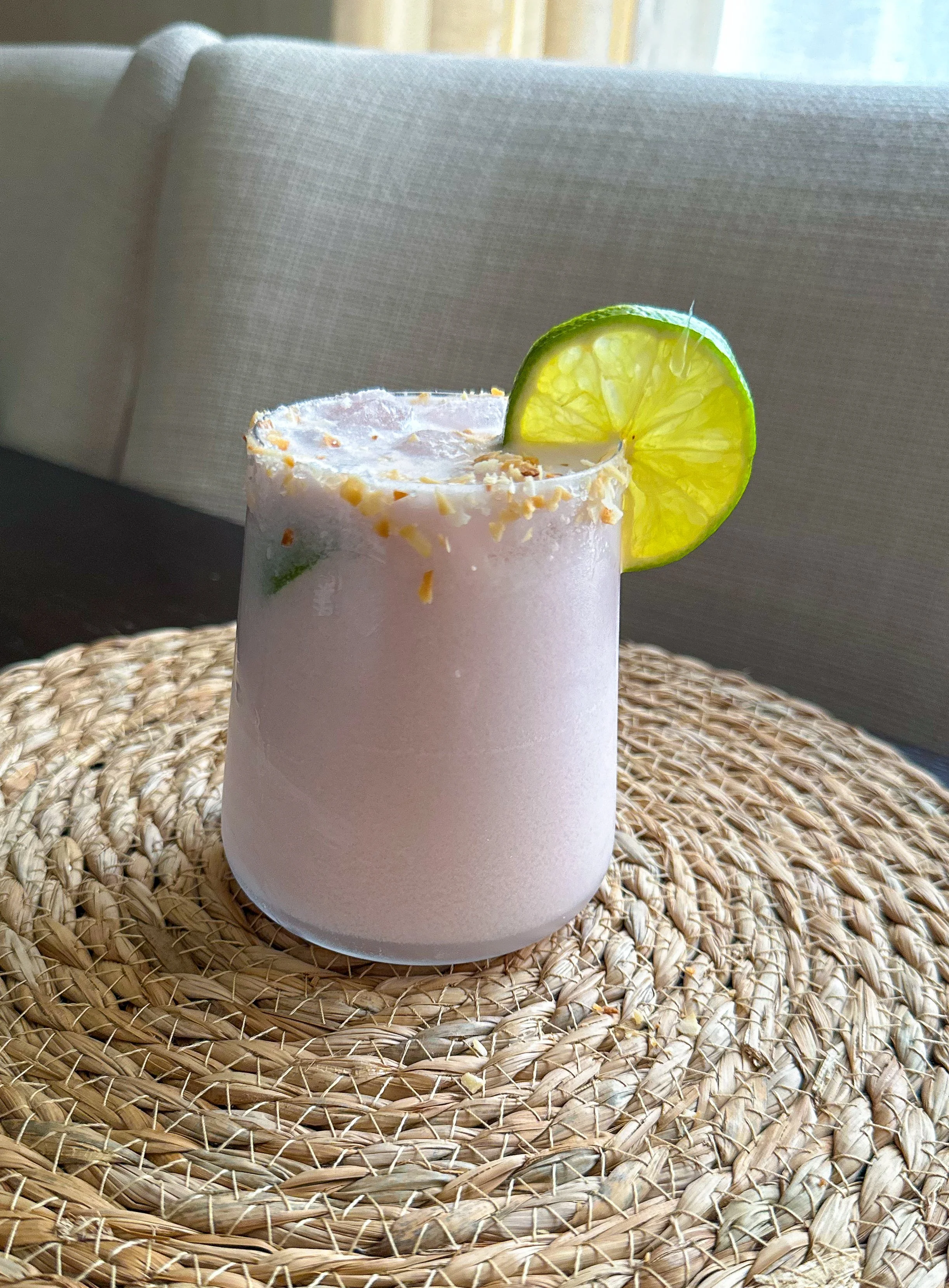 - Rim a glass with a mix of toasted coconut and kosher salt.