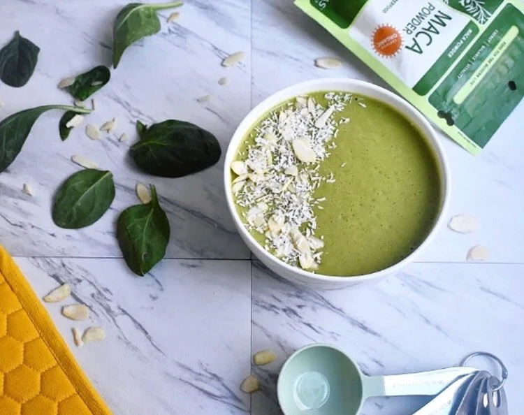 Power up your day with this Tropical Green Power Bowl, a nutrient-packed smoothie bowl that combines fresh greens, tropical fruits, and energizing superfoods. The creamy base features baby spinach and frozen pineapple blended to perfection with a touch of banana and maca powder for mood and hormone support.